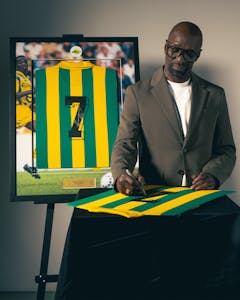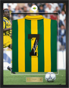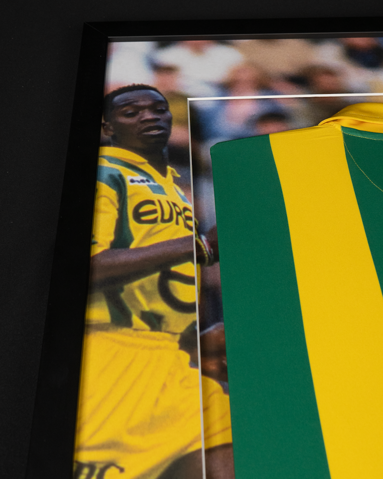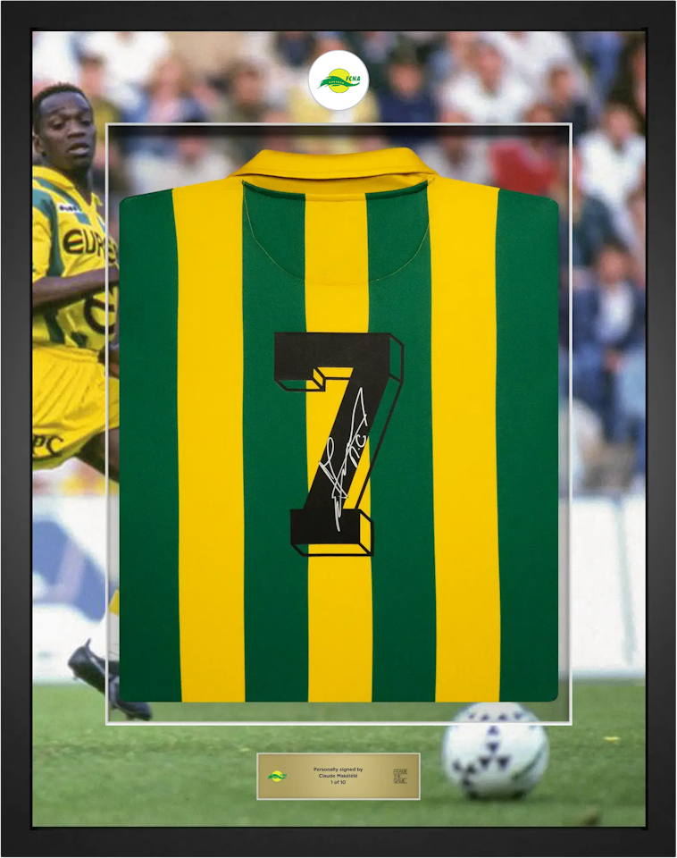 This FC Nantes 1994/95 home shirt is signed by Claude Makélélé and immortalised in a limited edition hand-crafted frame as one of 10 pieces celebrating his early career. The shirt is displayed against a background featuring Claude Makélélé playing for FC Nantes. Celebrate this unforgettable era that highlights the beginning of one of football’s greatest legends.